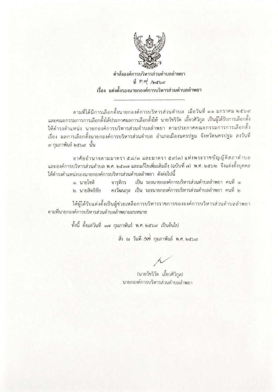 คำสั่ง มอบหมายอำนาจของนายกองค์การบริหารส่วนตำบลลำพยา ให้รองนายกองค์การบริหารส่วนตำบลลำพยา และปลัดองค์การบริหารส่วนตำบลลำพยาปฏิบัติราชการแทน